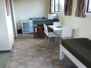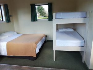 This cabin has one separate bedroom, kitchenette and studio living area. The one bedroom with two single bunk beds, while the studio living area has a double bed and single bunk bed. Bed linen is provided for all booked guests.